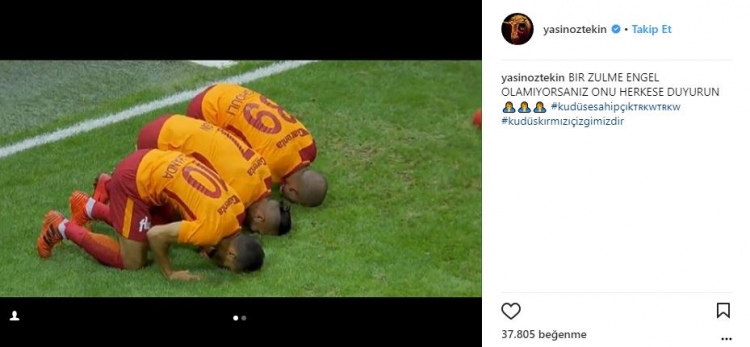 Milli futbolcu Yasin Öztekin, sosyal medya hesabı Instagram'dan secdeye gittikleri fotoğrafı paylaşarak, "Bir zulme engel olamıyorsanız onu herkese duyurun." ifadelerini kullandı.
