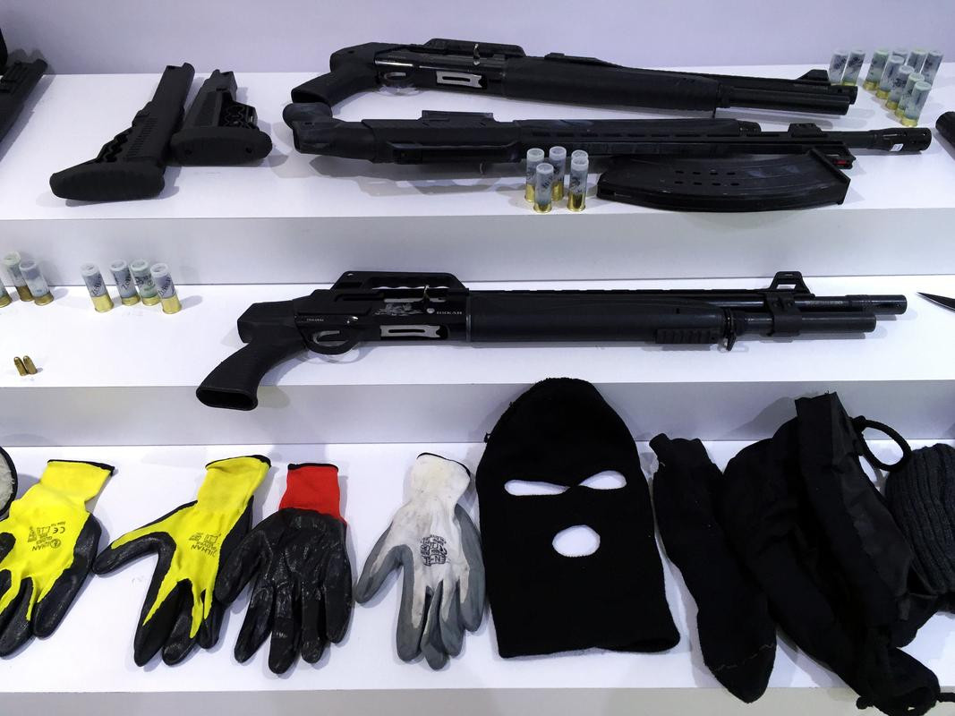 Şüphelilerden 3 pompalı tüfek, 2 şarjör, 3 dipçik, 30 fişek, kar maskeleri, eldivenler ve bir adet fener görünümlü elektro şok cihazı ele geçirildi.