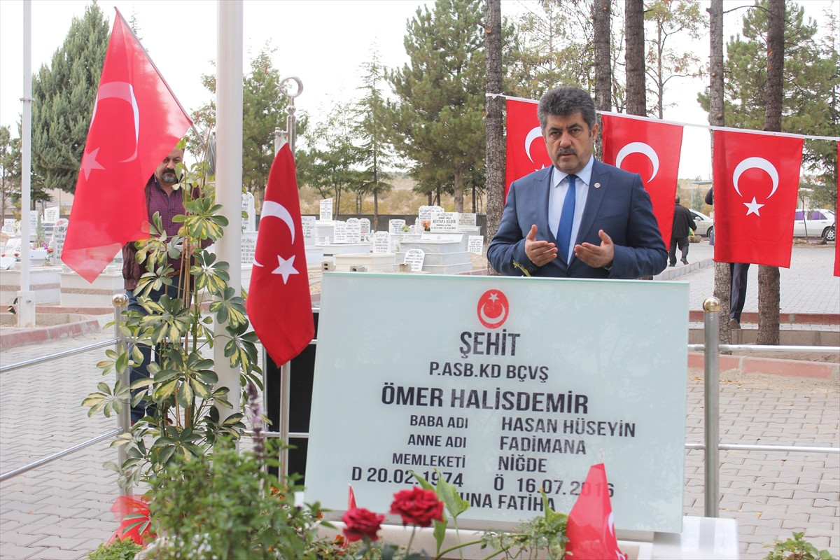 Beraberindeki gazetecilerle Bor ilçesindeki Çukurkuyu belde mezarlığına gelen Demir, Fetullahçı Terör Örgütü'nün darbe girişimi sırasında Özel Kuvvetler Komutanlığında darbeci generali vurduktan sonra şehit edilen Halisdemir'in kabri başında dua ederek, üzüntülerini dile getirdi.