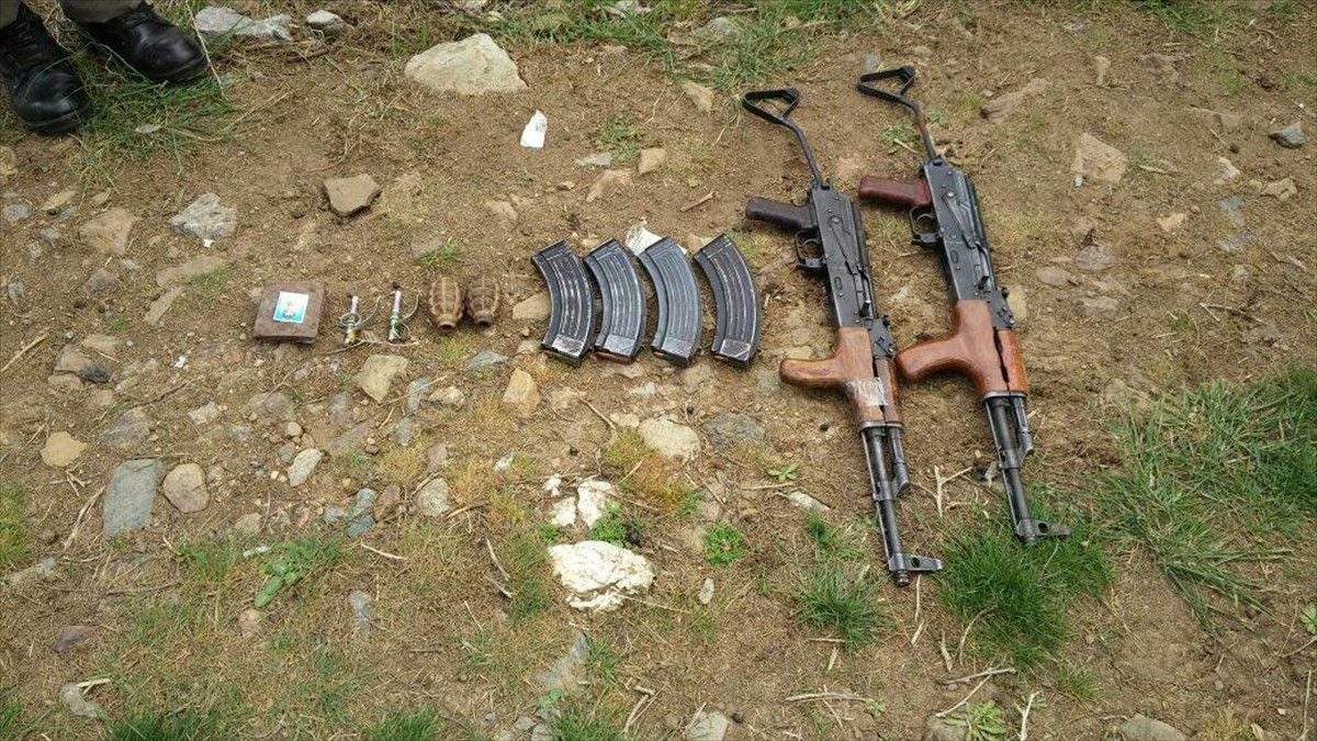 Bölgede yapılan kazıda, poşet içinde toprağa gömülmüş ikişer Kalaşnikof, savunma tipi el bombası ve el bombası ateşleme fünyesi, 4 şarjör ile cüzdan ele geçirildi.