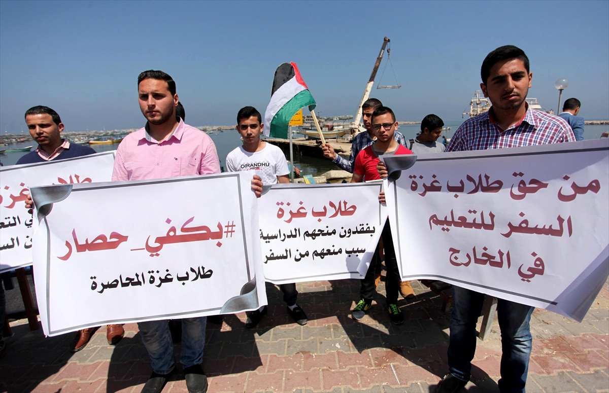 Gazze Şeridi'ndeki “Ambargonun Kırılması ve Yeniden İmar Komitesi”nin çağrısıyla balıkçı iskelesinde düzenlenen gösteride, "Deniz koridoru hakkımızdır", "Gazzeli öğrenciler abluka nedeniyle yurt dışında eğitim alamıyor" yazılı dövizler taşındı.