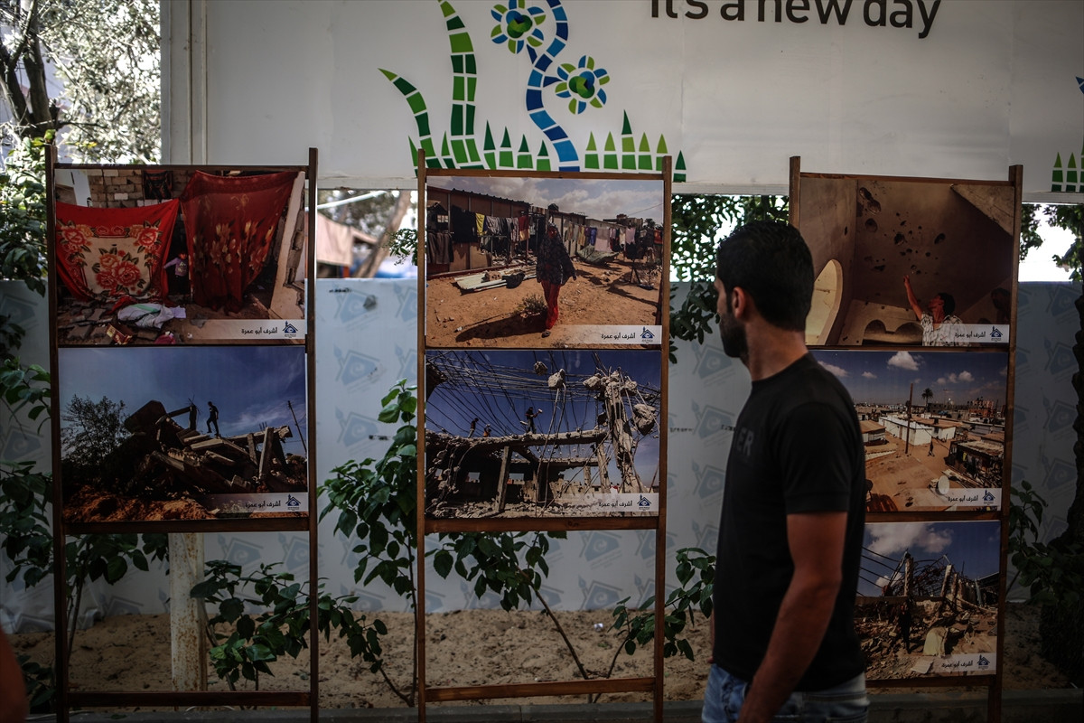 "Gazze'nin Yeniden İmarı Tamamlanmadı" adıyla düzenlenen sergide, İsrail'in Gazze Şeridi'ne yönelik saldırılarında yıkılan evlere, ev sahiplerine ve onların yaşadığı prefabrik konutlara ait 58 kare fotoğraf yer aldı.