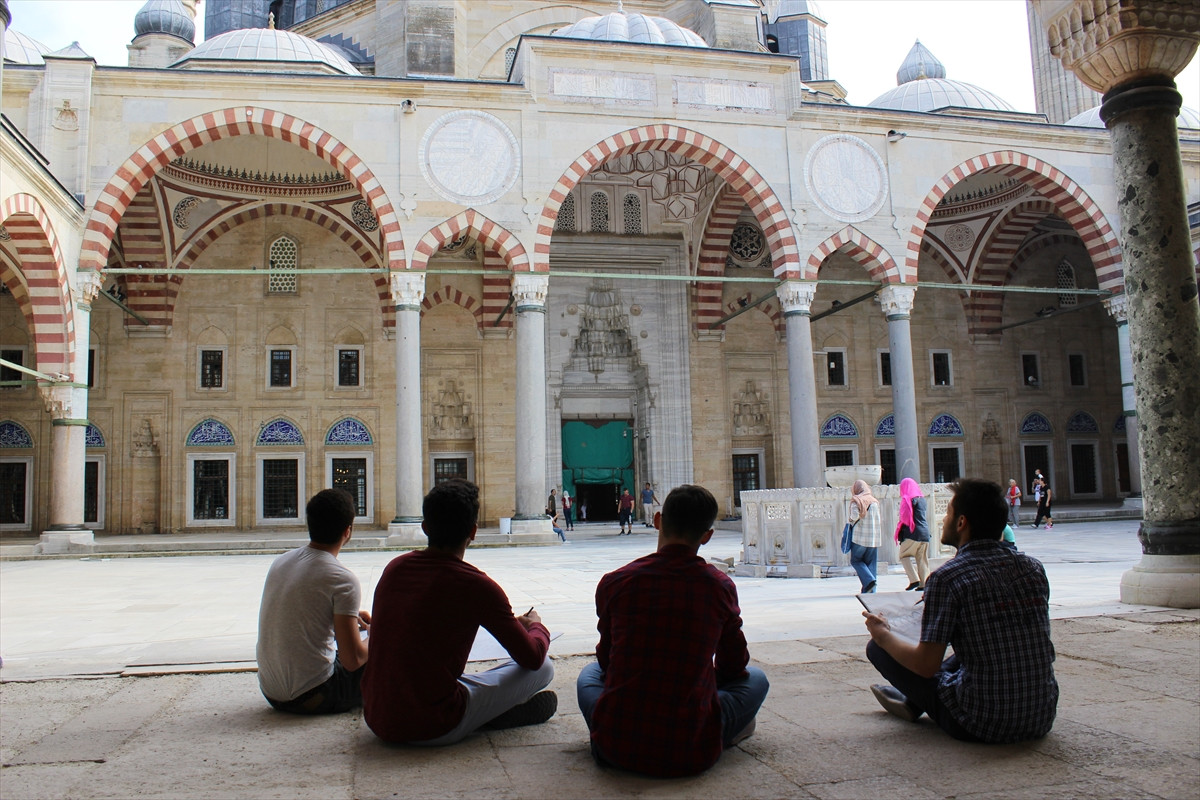 Derslerine giren akademisyenlerin anlatımlarının ardından ödevlerini hazırlamak üzere Selimiye Camisi'ne giden öğrenciler, burada eskizlerini tamamlıyor.