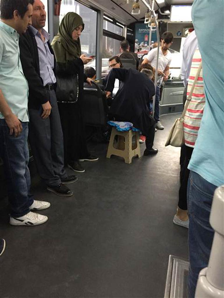 Bir vatandaş bu duruma ilginç bir çözüm buldu. İkinci durak Hadımköy'den metrobüse binen vatandaşın elinde tabure vardı.