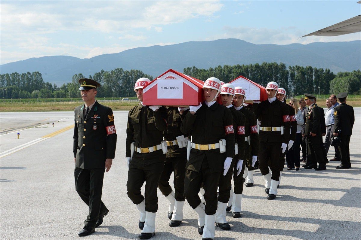 Uçaktan indirilen anne Nuran ve kızı Berrin Doğru'nun Türk bayrağına sarılı tabutları askerlerin omuzlarında Zile Belediyesine ait cenaze aracına taşındı. Cenazeler Zile Devlet Hastanesi morguna kaldırıldı.