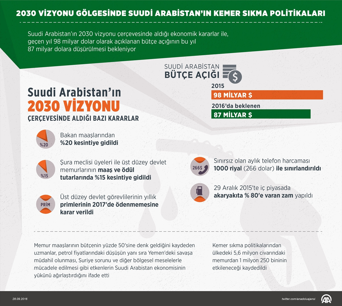 Riyad yönetiminin 26 Eylül'de açıkladığı son kemer sıkma paketinde bakan ve bakan düzeyindeki devlet görevlileriyle Şura Meclisi üyeleri ve birinci dereceden devlet memurlarının maaş, ödül ve sosyal haklarında kesintiye gidilmişti.