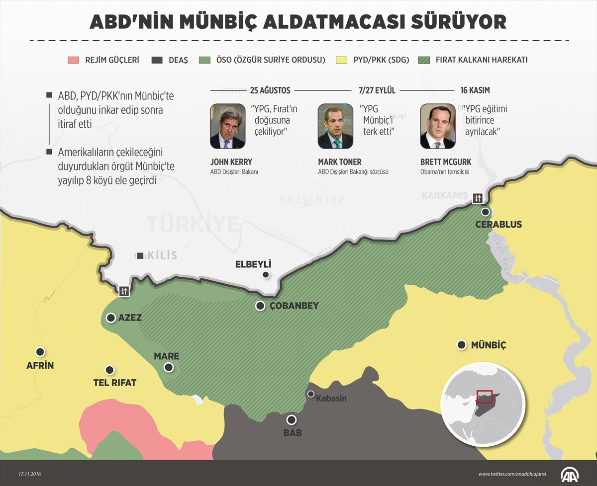 ABD Başkanı Barack Obama'nın DEAŞ'la Mücadele Özel Temsilcisi Brett Macgurk, dün Twitter hesabındaki paylaşımında, "yerel unsurlara eğitim vermek için" Münbiç'te bulunan örgütün bu işi tamamlayarak ilçeden ayrılacağını duyurmuş, böylece PYD/PKK'nın bölgedeki varlığını da itiraf etmişti.