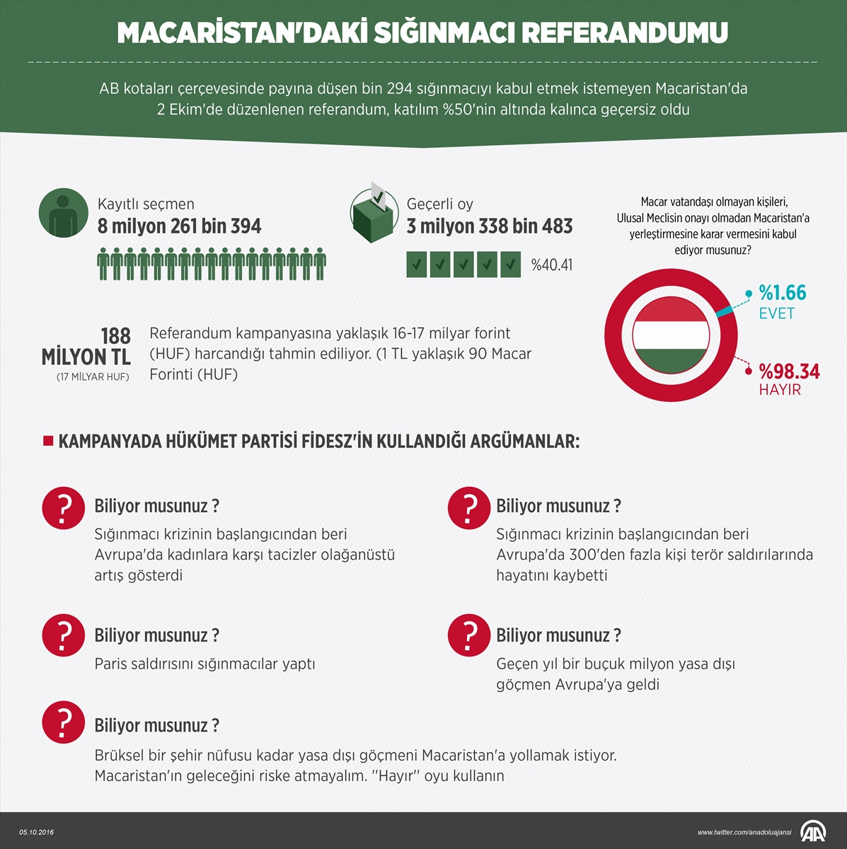 Referandum öncesi yapılan araştırmalar, Macar halkının yaklaşık yüzde 80'inin sığınmacıların Macaristan'a gelmesini kabul etmediğini gösteriyordu. Seçime katılımın yüzde 40'ta kalarak geçersiz olması ise Orban'ın sığınmacı krizini kullanarak kendi gücünü pekiştirmeye çalıştığını ancak Macar halkının buna karşı çıktığını ortaya koydu. Seçimlerde alınan yüzde 98'lik 'Hayır' oy oranının Fidesz ve Jobbik'in oy oranına yakın olduğu da göz önünde tutulmalı. Aslında Macarlar bu seçimle, Macaristan hükümetinin tüm sorunları sığınmacılar üzerinden kapatmaya çalışmasını kabul etmediğini göstermiş oldu.