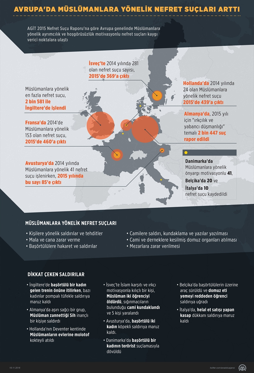 Avrupa Güvenlik ve İşbirliği Teşkilatı (AGİT) Demokratik Kurumlar ve İnsan Hakları Ofisinin yayımladığı "2015 Nefret Suçu Raporu"na göre, Avrupa'nın bazı ülkelerinde Müslümanlara yönelik nefret suçları büyük oranda arttı.