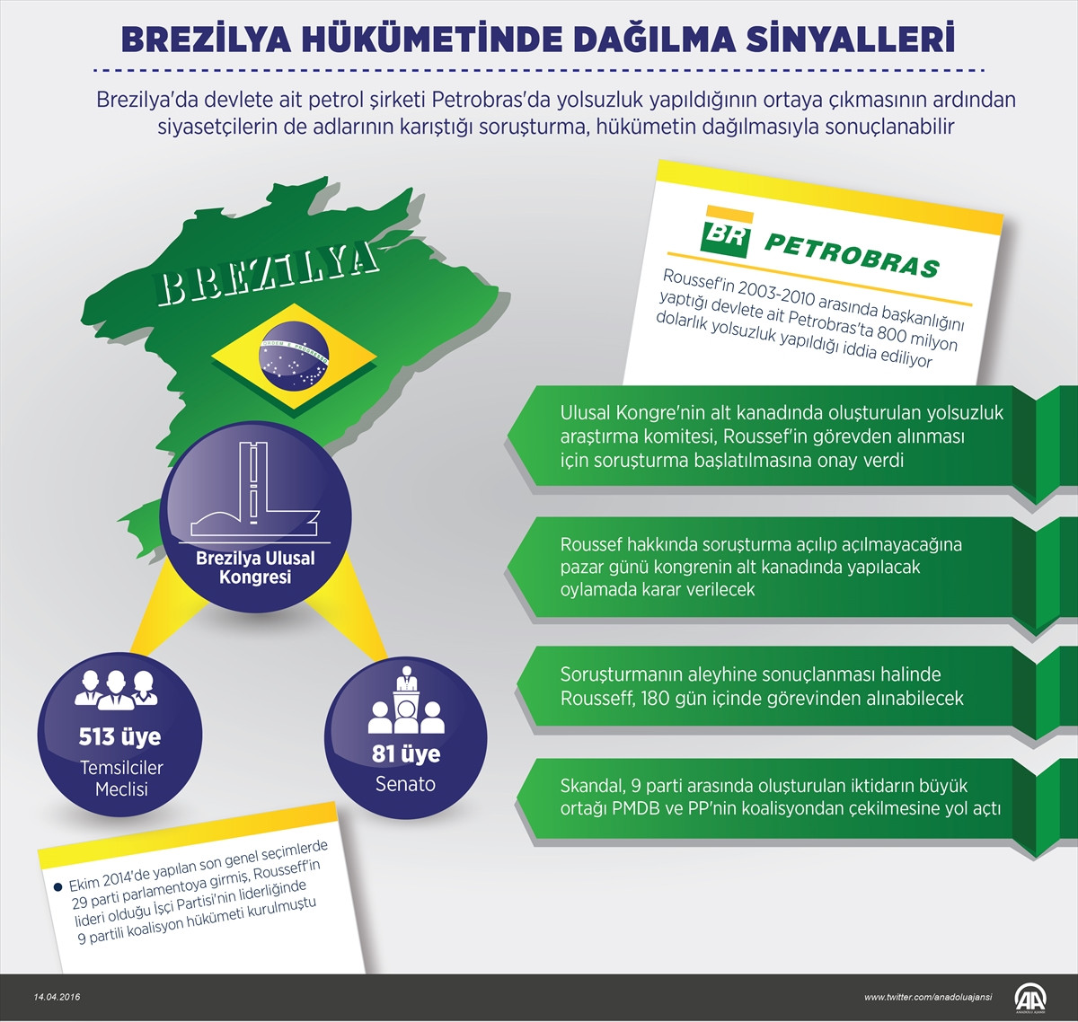 Brezilya Devlet Başkanı Dilma Rousseff'in 2003-2010 arasında Petrobras'ın başkanlığını yaptığı sırada şirkette 800 milyon dolarlık yolsuzluk yapıldığı, ihalelere fesat karıştırıldığı, yetkililerin rüşvet aldığı iddia ediliyor. İki eski koalisyon ortağı, Ulusal Kongrenin alt kanadında Rousseff hakkında soruşturma başlatılmasına onay vereceklerini açıkladı.
