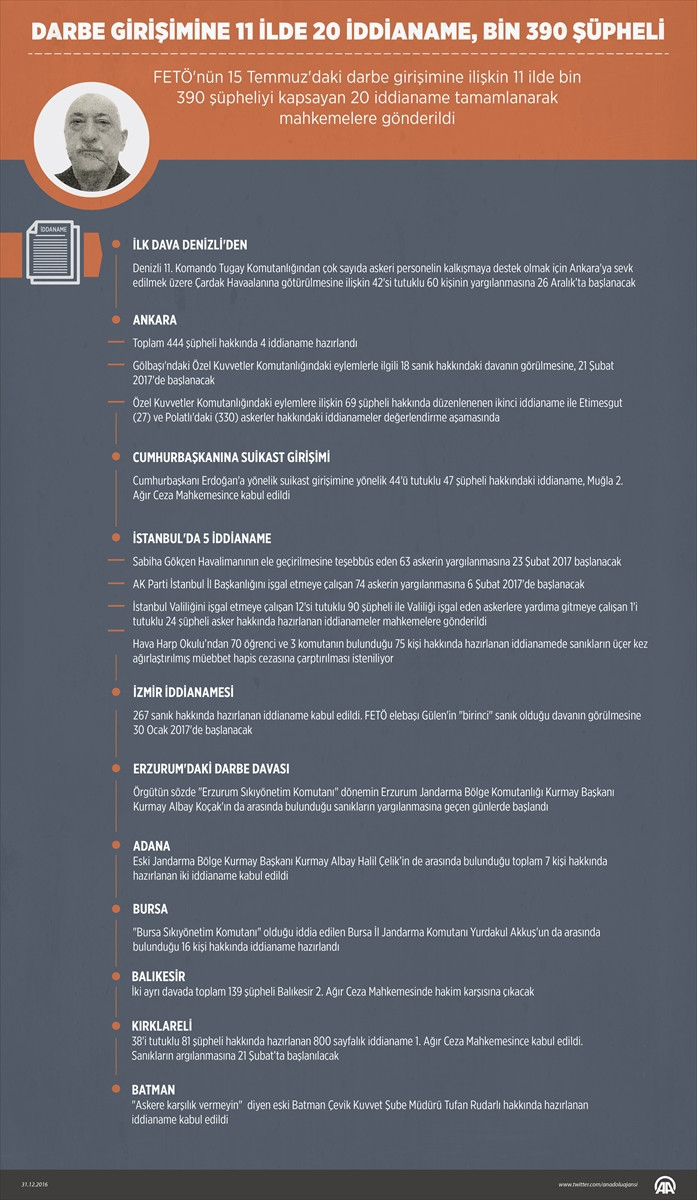 AA muhabirinin derlediği bilgilere göre, darbe girişimiyle ilgili bugüne kadar İstanbul'da 5, Ankara'da 4, Balıkesir ve Adana'da ikişer, Muğla, Batman, Kırklareli, Denizli, İzmir, Erzurum ve Bursa'da birer iddianame düzenledi. Ankara'daki iddianamelerde toplam 444, İstanbul'da 326, İzmir'de 267 kişi şüpheli olarak yer aldı.