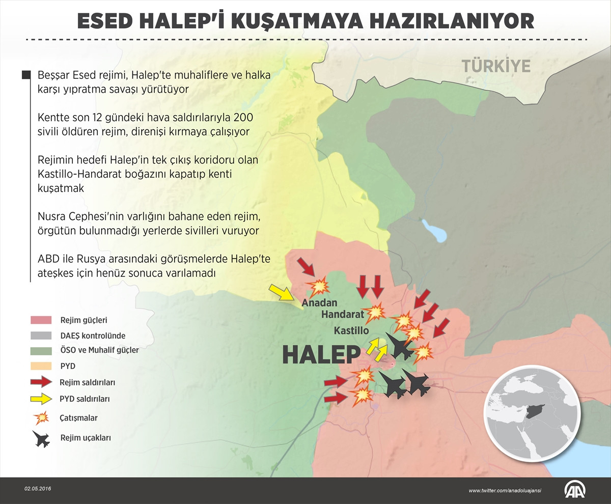 Şubat ayı başında Rus savaş uçaklarının hava desteğiyle, muhalifleri kuzeyden çevreleyerek, Türkiye-Halep insani koridorunu kapatan Esed rejiminin şimdiki hedefi, merkezdeki muhaliflerin tek çıkış yolu olan Kastilo-Handarat boğazını kapatmak. Boğaz, Halep merkezden İdlib'e, oradan Türkiye sınırına uzanan muhaliflerin kontrolündeki alana geçit sağlıyor.