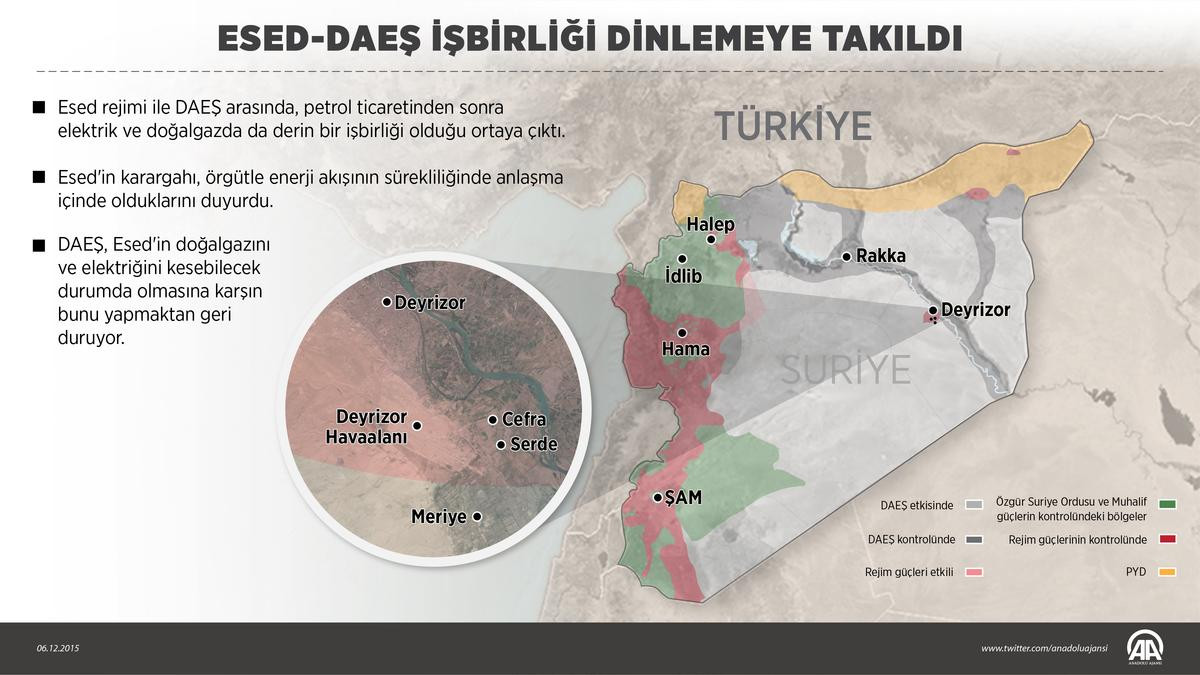 ANKARA (AA) - Suriye'de Beşşar Esed rejimi ve terör örgütü DAEŞ, petrolün yanısıra ülkenin elektrik ve doğalgaz altyapısını birlikte kullanma konusunda işbirliği içinde. DAEŞ, rejimin elektriğini ve doğalgazını kesme imkanına sahip olduğu halde bunu yapmayarak Esed'e hayat veriyor.