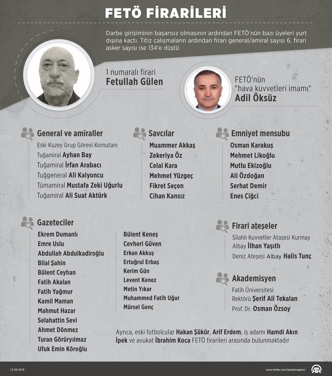 FETÖ'nün darbe girişimine ilişkin soruşturma kapsamında Ankara'daki Akıncı Üssü'nde gözaltına alındıktan sonra salıverilen FETÖ'nün "hava kuvvetleri imamı" olduğu ileri sürülen Adil Öksüz de kaçan isimlerin başında geliyor.