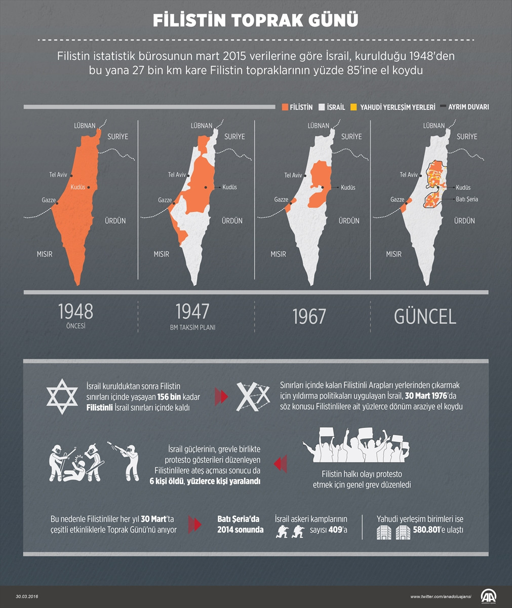 Filistin İstatistik Merkezi'nin Mart 2015 verilerine göre İsrail, 27 bin kilometrekarelik Filistin topraklarının yüzde 85'ine el koymuş durumda. Filistinliler ise bu alanın sadece yüzde 15'ini kullanabiliyor.