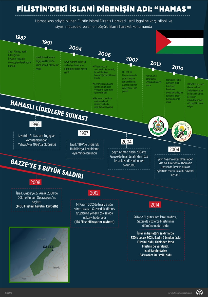 KUDÜS (AA) – Filistin'de İsrail işgaline karşı silahlı ve siyasi mücadele veren en büyük İslami hareket konumundaki Filistin İslami Direniş Hareketi Hamas, 1987'de Şeyh Ahmed Yasin liderliğinde kuruldu.