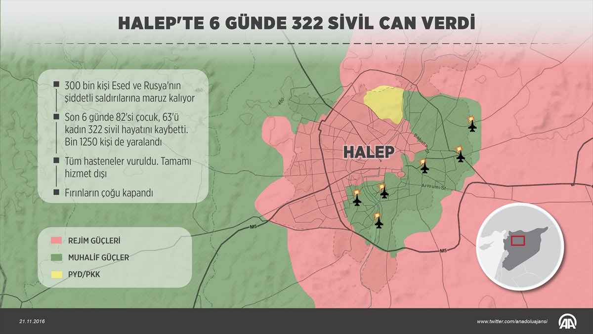 ANKARA (AA) - Suriye'de son 6 günde, Beşşar Esed rejimi tarafından düzenlenen ve Rus Hava Kuvvetlerinin destek verdiği saldırılarda, Halep kent merkezinin doğusunda 322 sivil hayatını kaybetti, bin 150'si yaralandı.