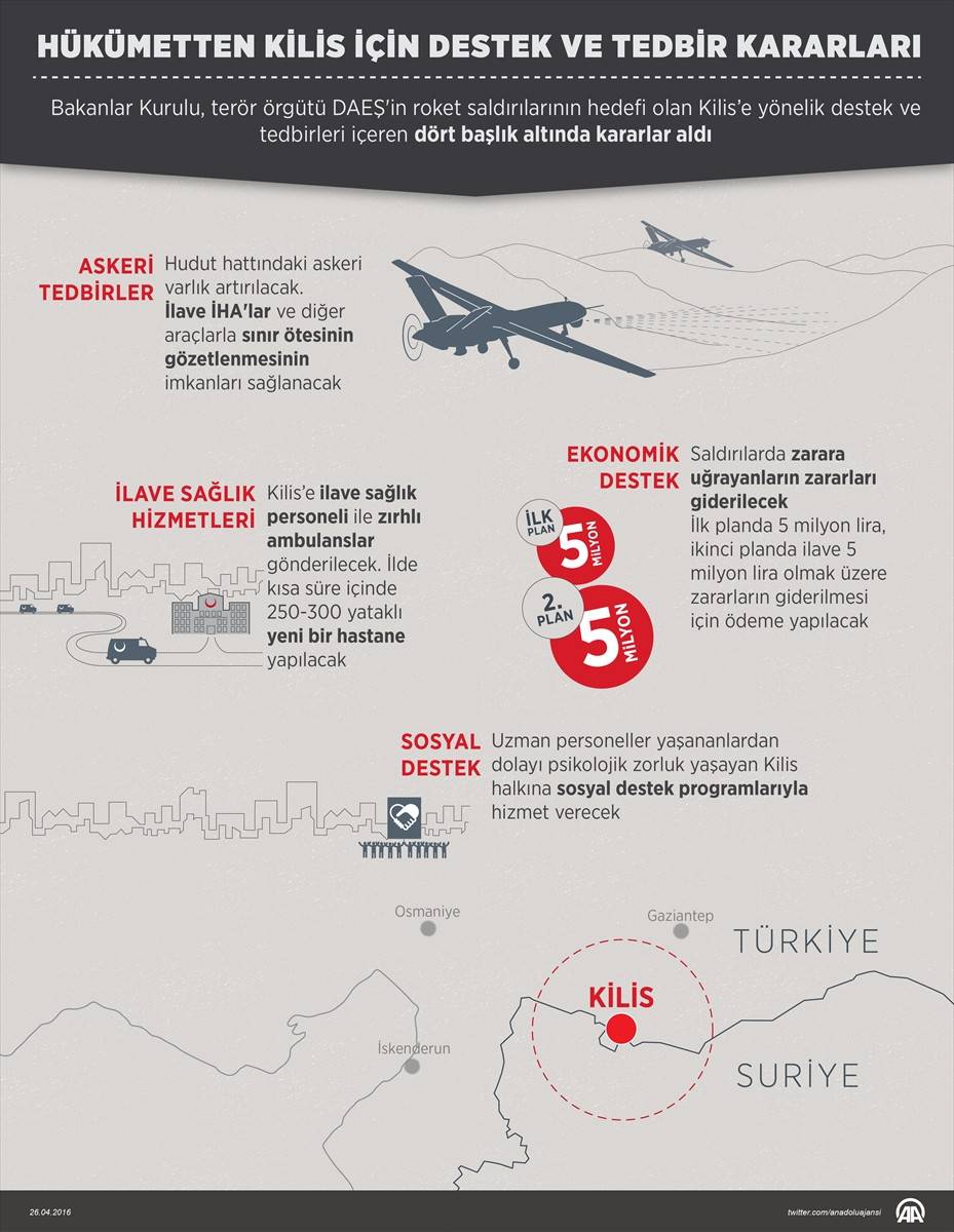 İlave sağlık hizmetleri: Başta doktorlar olmak üzere ilave sağlık personeli ile zırhlı ambulanslar Kilis'e gönderilecek. Kilis'e kısa süre içinde 250-300 yataklı yeni bir hastanenin yapılabilmesi ve Kilis'in sağlık hizmetleri bakımından da daha iyi ileri noktaya getirilmesi için çalışmalar başlatılacak."