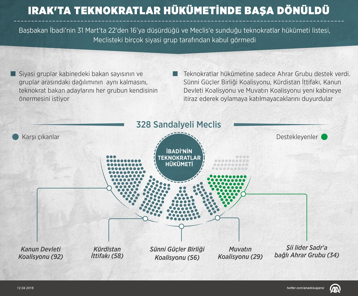 Başbakan İbadi, bakanlık sayısını 22'den 16'ya düşürdüğü teknokratlar hükümeti listesini 31 Mart'ta meclise sundu. Yeni kabine için mecliste 10 gün içerisinde güven oylaması yapılması bekleniyordu ancak sürenin dolmasına rağmen oylama gerçekleşmedi.