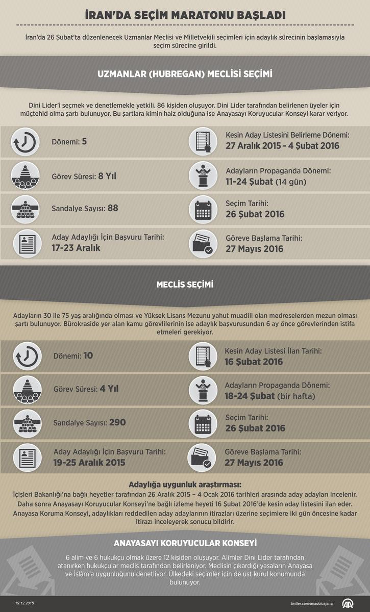İSTANBUL (AA) - İran, 26 Şubat'ta düzenlenecek 5'inci Uzmanlar Meclisi (Hubregan) ve 10'uncu dönem milletvekili seçimleri için adaylık sürecinin başlamasıyla seçim sürecine girdi.
