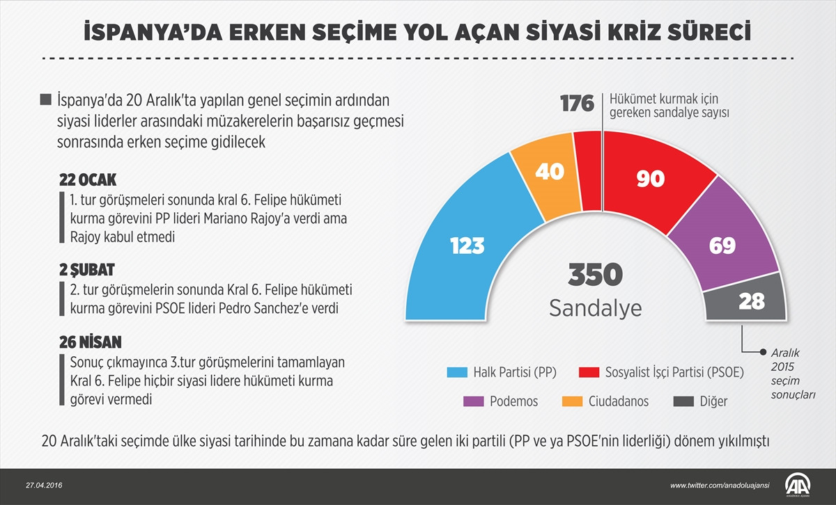 20 Aralık seçimlerinde oy oranı yüzde 28'e kadar inse de İspanya'daki en büyük siyasi parti olmayı sürdüren PP, meclise giren diğer siyasi partilerin hiçbirinin desteğini alamayınca hükümet kurma müzakerelerine başlamaya bile gerek duymadı.