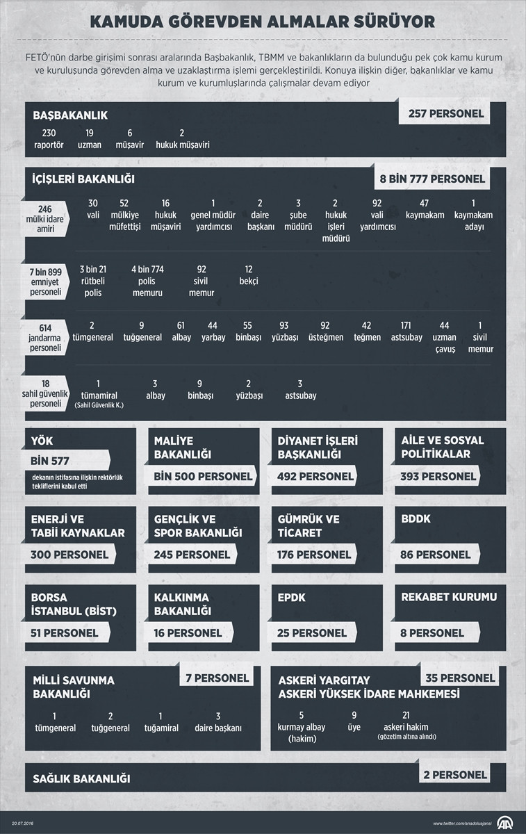 ANKARA (AA) - FETÖ'nün darbe girişimi sonrası aralarında Başbakanlık, TBMM ve bakanlıkların da bulunduğu pek çok kamu kurum ve kuruluşunda görevden alma ve uzaklaştırma işlemi gerçekleştirildi.