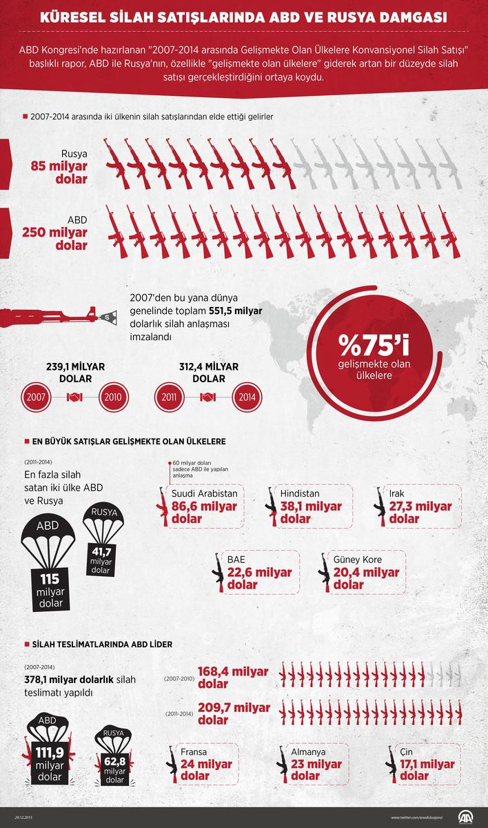 Küresel silah satışında ABD, 2014'te 36,2 milyar dolarlık anlaşma ile en büyük paya sahip olurken Rusya 10,2 milyar dolarlık anlaşmayla ikinci sırada yer aldı.