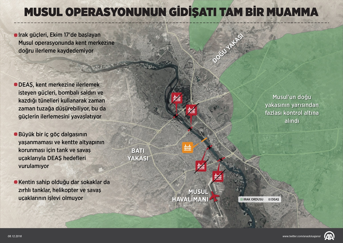 Irak güçleri, terör örgütü DEAŞ'ın ülkedeki son kalesi Musul'u kurtarma operasyonuna 17 Ekim'de başlasa da DEAŞ'ın kazdığı ve en güçlü savunma aracı olarak kullandığı tünellerden dolayı ilerleme kaydedemiyor. DEAŞ'ın bombalı araç ve keskin nişancılarla düzenlediği saldırıların da güvenlik güçlerinin ilerlemesini yavaşlattığı belirtiliyor. Kentin her iki yakası doğu ve batı bölgelerinde halen bir milyondan fazla sivilin evlerini terk etmemesi de operasyonun yavaş ilerlemesinin bir diğer nedeni olarak gösteriliyor.Operasyonun diğer gecikme nedeni ise, Tikrit ve Enbar illerinde yaşanan kötü tecrübelerin Musul'da yaşanmasının önüne geçilmesi. Ordu güçleri hem büyük bir iç göç dalgasının yaşanmaması hem de kentin altyapısının korunması için tank ve savaş uçaklarıyla DEAŞ hedeflerini vuramıyor. Kent merkezinde sivillerle iç içe yaşayan militanların etkisiz hale getirilmesi için sadece hafif tüfekler ve tanksavarlar kullanılıyor. Orduya ait zırhlı tanklar, helikopter ve savaş uçaklarının sokak çatışmalarında pek bir işlevinin olmadığı aktarılıyor. Kentin sahip olduğu dar sokaklar da zırhlı araçların giremediği bölgelerde işi daha da zorlaştırdığı gibi, şiddetli çatışmaların yaşanmasına da yol açıyor.