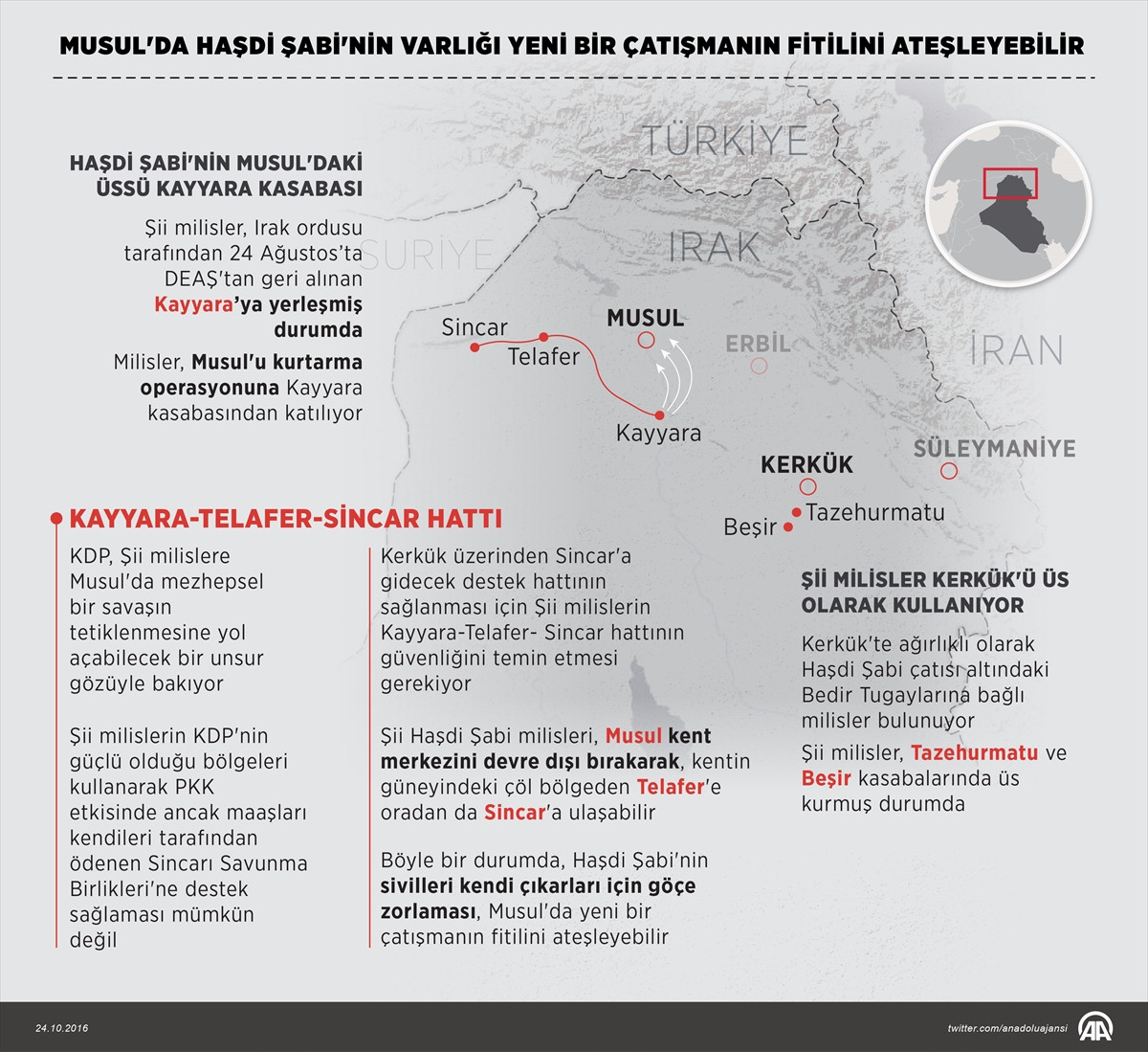 Bağdat'dan gelip Kerkük üzerinden Sincar'a gidecek olan lojistik destek hattının sağlanması için Şii milislerin Kayyara-Telafer- Sincar hattının güvenliğini temin etmesi gerekiyor. Şii Haşdi Şabi milisleri, Musul kent merkezini devre dışı bırakarak, kentin güneyindeki çöl bölgeden Telafer'e oradan da Sincar'a ulaşabilir. Bunun da gerçekleşmesi için söz konusu güzergahtaki Sünnilerin yerinden edilip, kent merkezi ya da başka bölgelere zorla göç ettirilmeleri gerekiyor.