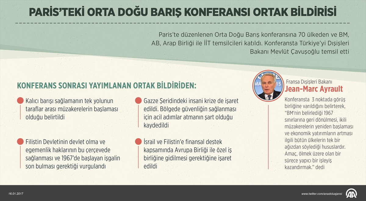 PARİS (AA) - Fransa'nın başkenti Paris’te düzenlenen Ortadoğu Barış Konferansı'nda Filistin ve İsrail arasında yürütülecek müzakerelerin bölgede kalıcı bir barış tesis etmenin tek yolu olduğu bildirildi.