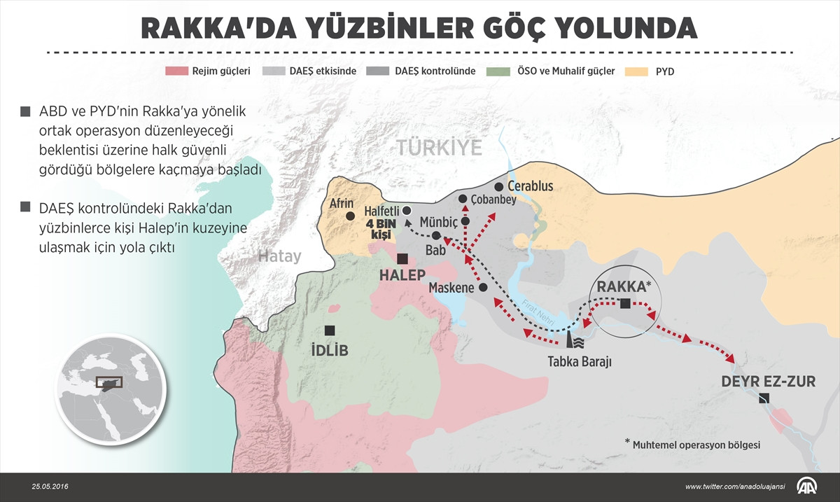 HALEP (AA) - ABD Hava Kuvvetleri ve terör örgütü PKK'nın Suriye uzantısı PYD’nin başını çektiği güçlerin DAEŞ kontrolündeki Rakka'ya operasyon başlatacağı iddiaları bölgede büyük bir göç hareketine sebep oldu.