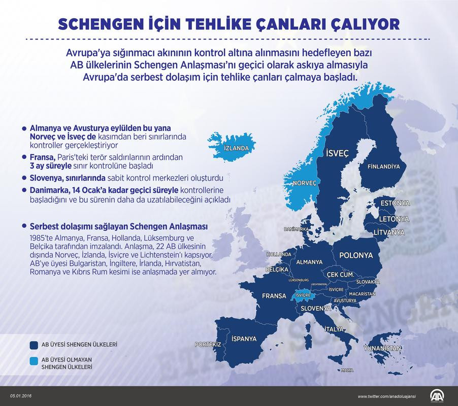 Almanya, özellikle güneyindeki Avusturya ve Çek Cumhuriyeti sınırında, Avusturya ise Slovakya ve Macaristan sınırlarında eylül ayından beri kontroller gerçekleştiriyor. Norveç de kasımdan beri Almanya, Danimarka ve İsveç’ten ülkeye gelen feribotlarda yolcuların kimliklerine bakıyor. Fransa ise Paris'teki terör saldırılarının ardından 3 ay süreyle sınır kontrolüne başlayarak Schengen'i askıya aldı. Sığınmacıların ülkeye girişini engellemek amacıyla Sırbistan sınırına duvar ören Macaristan, Romanya ve Schengen ülkesi Slovenya sınırlarında sabit kontrol merkezleri oluşturdu.