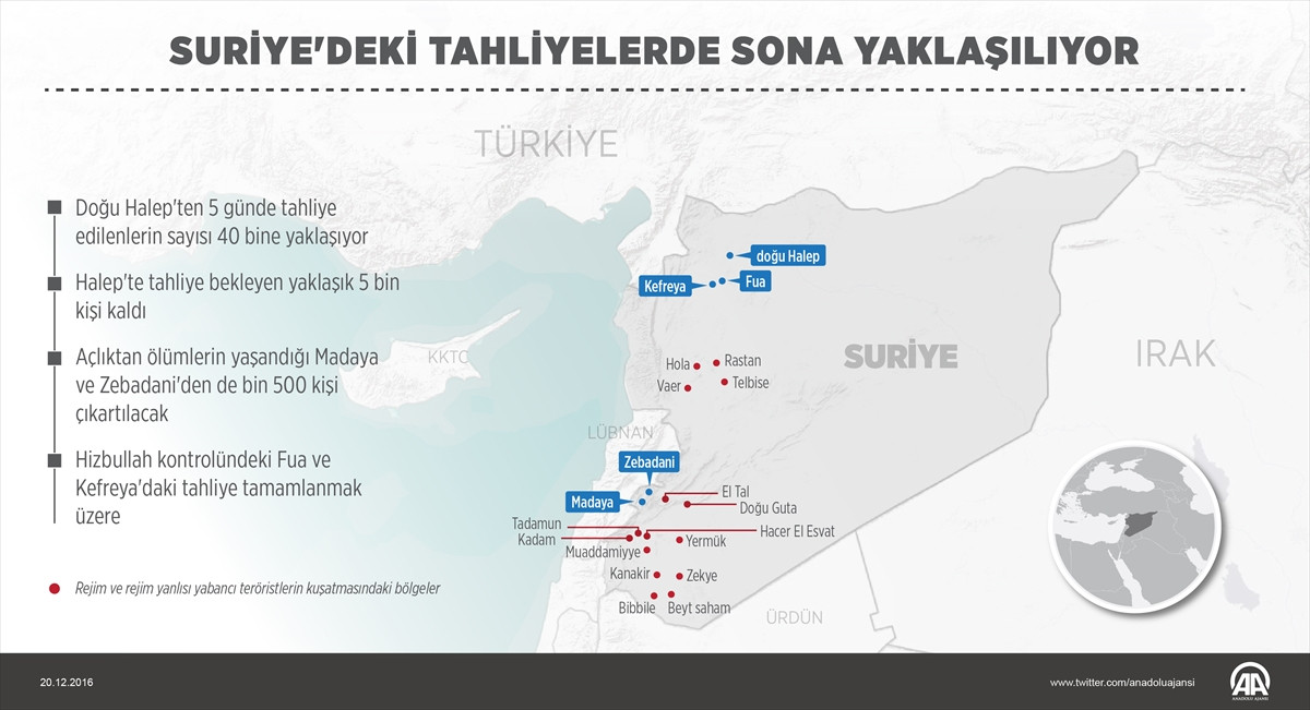 Doğu Halep'ten siviller ve muhalifleri tahliye eden ilk konvoy 15 Aralık'ta yola çıkmıştı. Tahliye operasyonunu yürüten yetkililerden alınan bilgiye göre, bölgeden çıkarılan Haleplilerin sayısının bu geceye kadar 40 bine ulaşması bekleniyor.