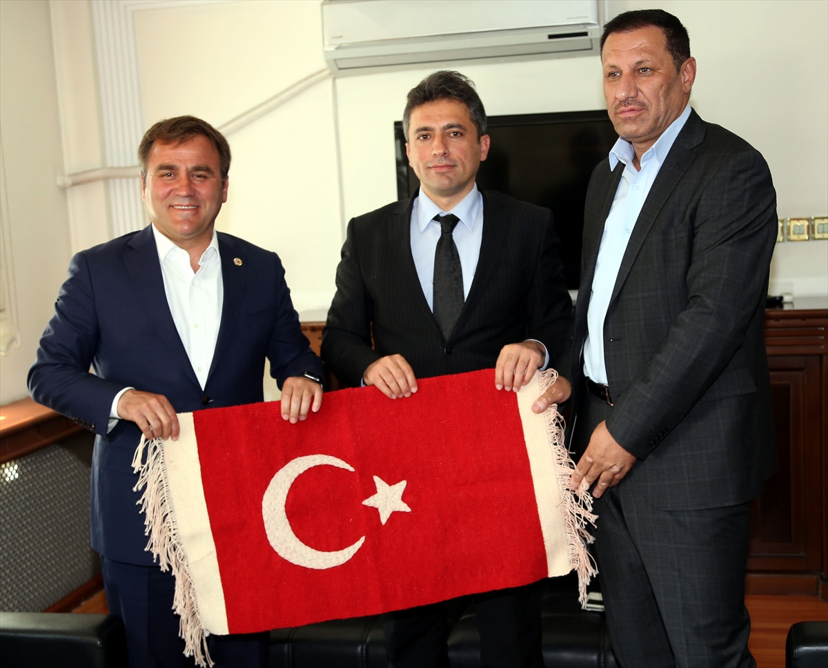 İlçedeki incelemeler sonrası Kaymakam İbrahim Çenet'i makamında ziyaret eden Çimen, el dokuması Türk bayrağını Çenet'e hediye etti.