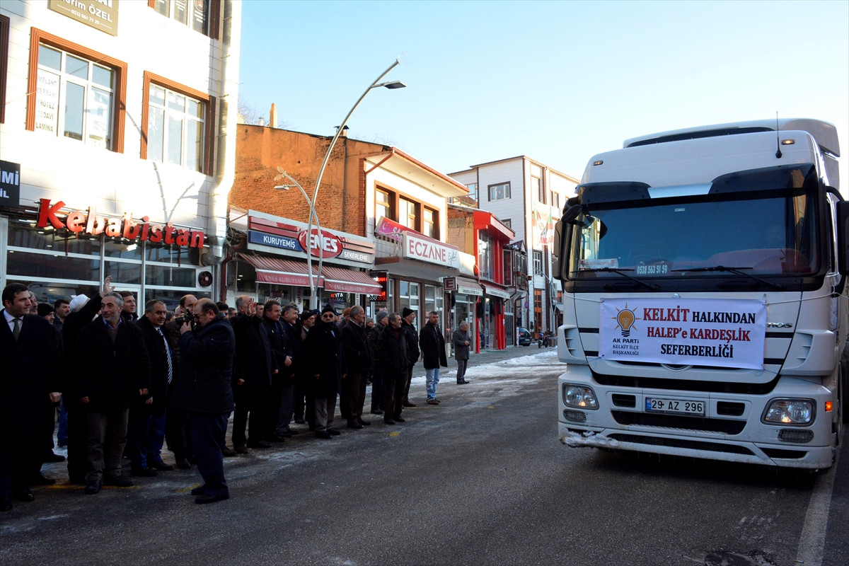 GÜMÜŞHANE (AA) - Kelkit ilçesinde yardım kampanyasında toplanan 40 ton un ve 70 ton kuru gıdanın yüklendiği 4 tır dualar eşliğinde Halep’e uğurlandı.