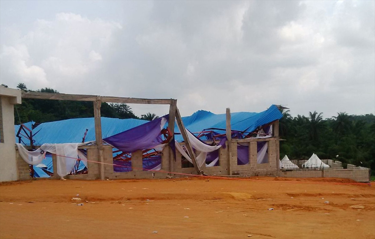 Yerel basında çıkan haberlere göre; eyaletin başkenti Uyo'daki Reigners Bible Kilisesi'nin çatısı, yüzlerce kişi Papaz Akan Week'in psikoposluk töreni için toplanmışken çöktü.
