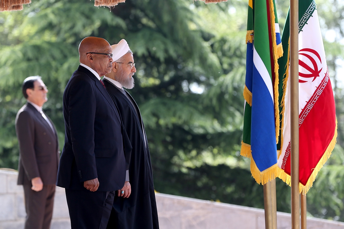 Güney Afrika Cumhurbaşkanı Jacob Zuma resmi temaslarda bulunmak üzere Tahran'a geldi. Zuma, İran Cumhurbaşkanı Hasan Ruhani tarafından Sadabad Sarayında resmi törenle karşılandı.