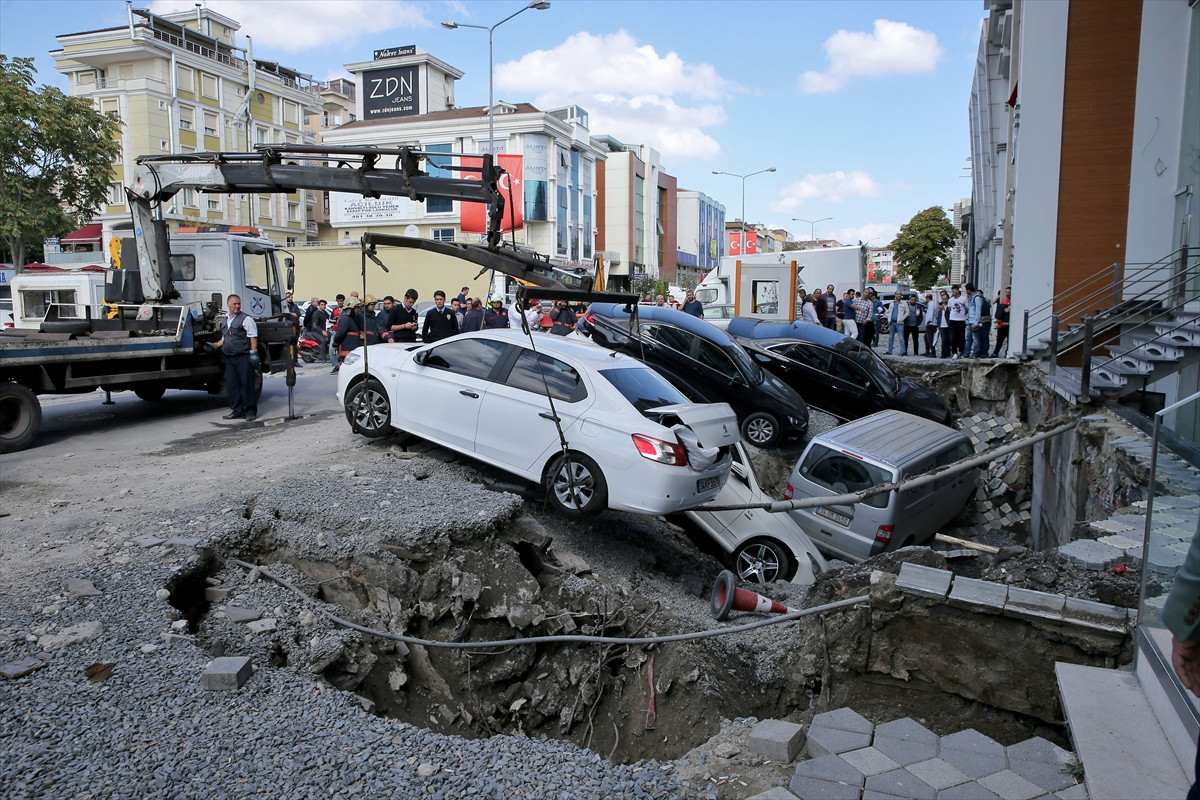 Çökme nedeniyle oluşan çukura düşen park halindeki 5 araçta hasar oluştu.