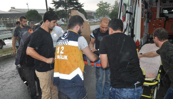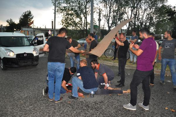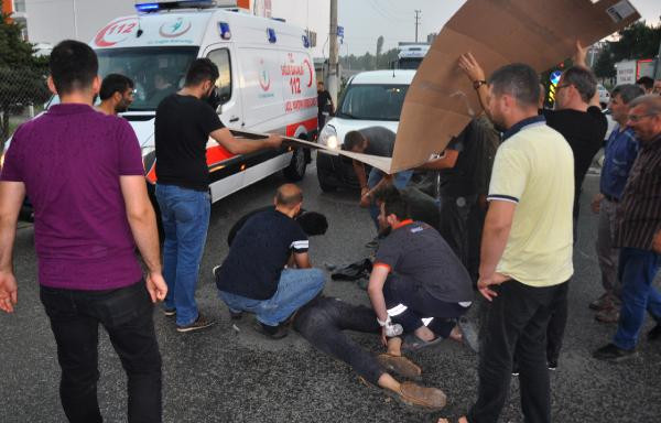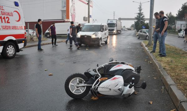 BURSA'nın İnegöl ilçesinde, hafif ticari araçla çarpışan motosikletin sürücüsü yaralandı. Çevredekilerin olay yerinde kartonla yağmurdan korumaya çalıştığı yaralı sürücü, hastaneye kaldırıldı.
