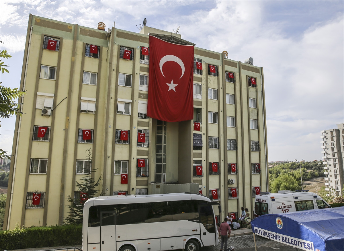 Ailenin evinin bulunduğu sokak ile buradaki binalara Türk bayrakları asılırken, yakınları da taziye için ailenin yanına geldi.