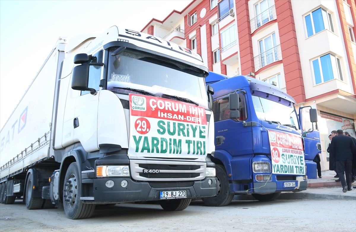 Çorum İHH Derneğinin öncülüğünde yürütülen kampanya çerçevesinde Memur-Sen, Büro-Sen, Genç İHH ve İhsander'in desteğiyle toplanan un, makarna ve bakliyat başta olmak üzere yaklaşık 100 tonluk gıda malzemesi yüklü 4 tırın Halep'e uğurlanması için Eşref Hoca Caddesi'ndeki dernek merkezi önünde tören düzenlendi.