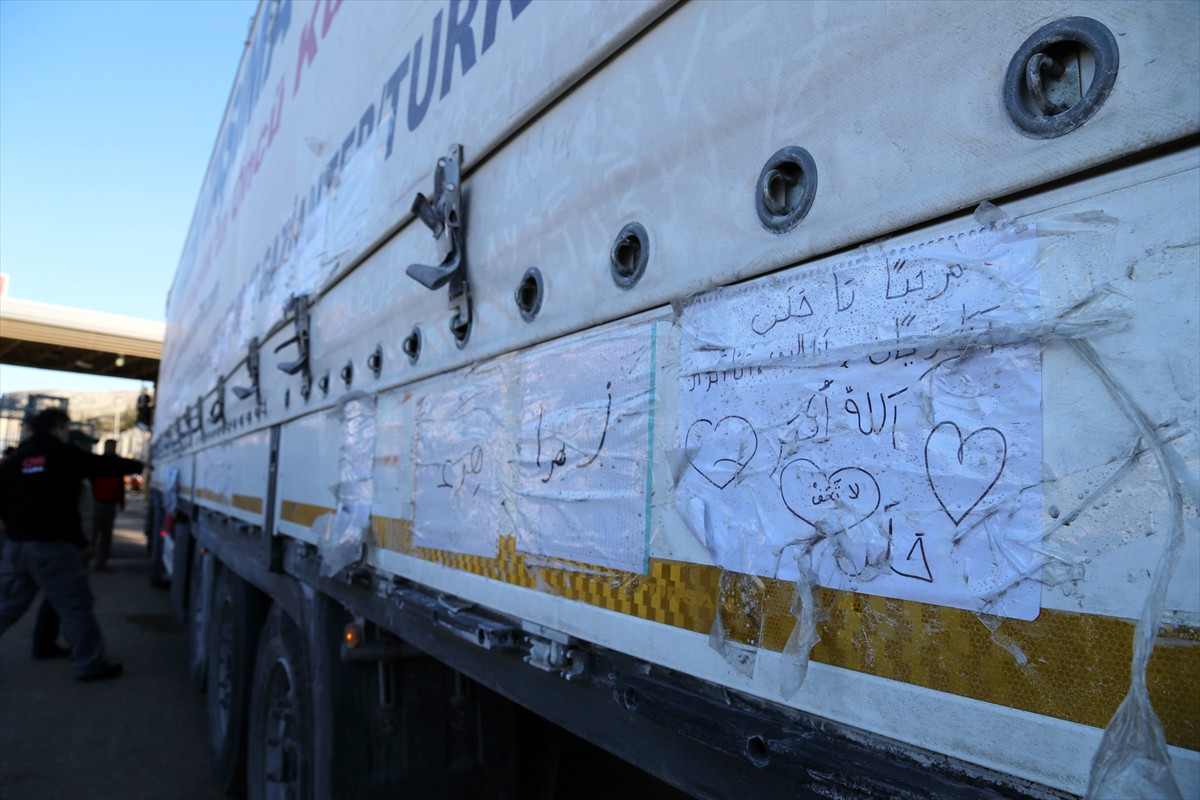 Suriye'ye geçen tırların birinin dorsesine yapıştırılmış notlar dikkati çekti. İstanbul Çamlıca İmam Hatip Lisesi öğrencileri tarafından toplandığı öğrenilen yardımları taşıyan tırda, Arapça ve Türkçe yazılmış ''Türkiye Halep el ele'' ve ''Allah yardımcınız olsun'' gibi notların yer aldığı görüldü.