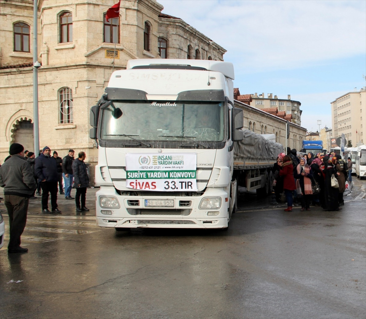 SİVAS (AA) - İnsan Hak ve Hürriyetleri (İHH) İnsani Yardım Vakfınca başlatılan "Halep'e yol açın" kampanyası kapsamında Sivas'ta toplanan yardımların yüklendiği 9 tır, Halep'e ulaştırılmak üzere yola çıkarıldı.
