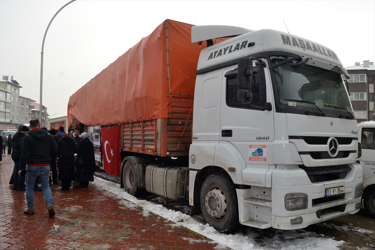 Törenin ardından, insani yardım malzemelerinin bulunduğu yardım tırı, dualar eşliğinde Halep'e gönderildi.