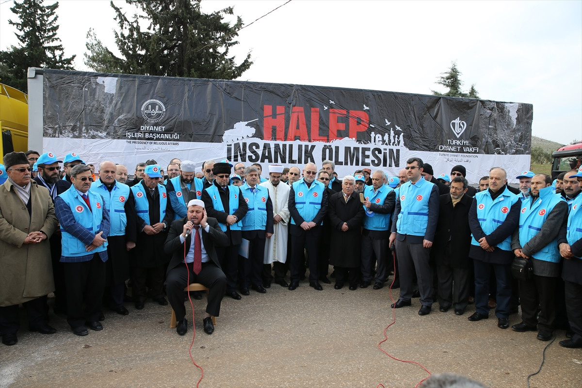 HATAY (AA) - Diyanet İşleri Başkanlığı ve Türkiye Diyanet Vakfı ile sivil toplum örgütü temsilcilerinin destekleriyle Türkiye genelinde başlatılan "Halep'te İnsanlık Ölmesin" kampanyası kapsamında toplanan yardımları taşıyan tırlar, törenin ardından İdlib'e hareket etti.