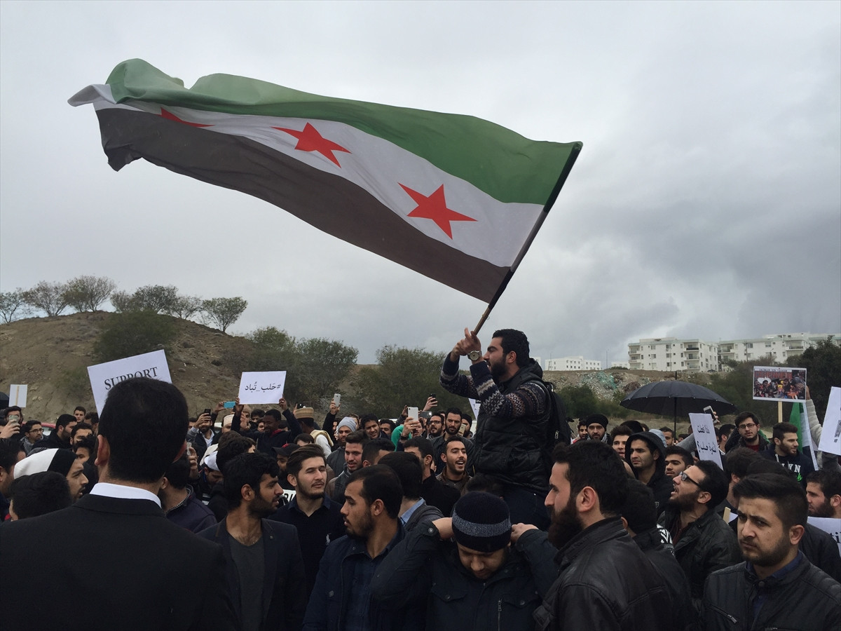Daha sonra ellerinde, "Kıbrıs Halep İçin Kıyamda", "İstikamet Halep Yükümüz İnsanlık", "Halep'e Destek" pankartları taşıyan grup üyeleri, İran ve Rusya aleyhine slogan attı.