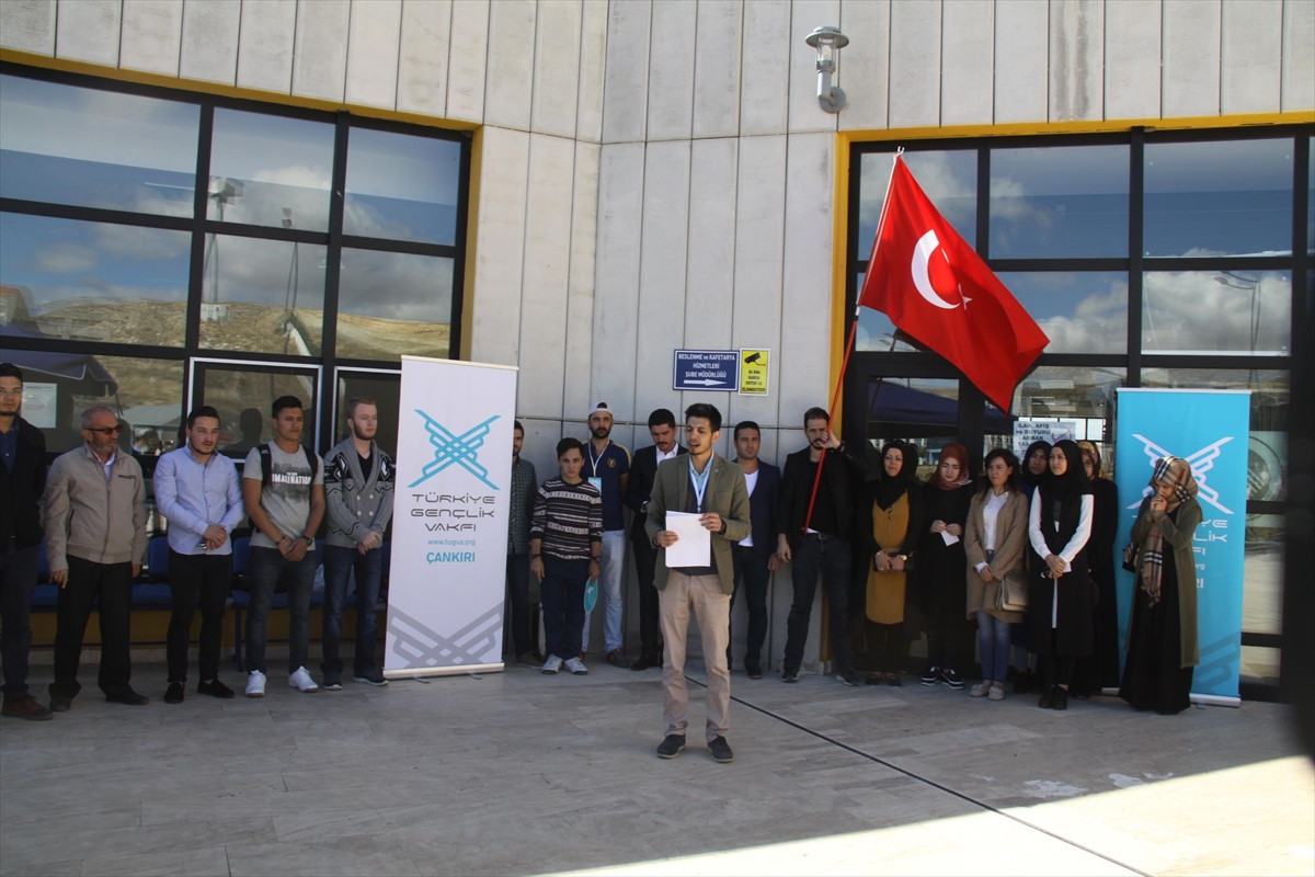 Çankırı Karatekin Üniversitesi Uluyazı Kampüsü'ndeki yemekhane önünde toplanan bir grup TÜGVA üyesi ile öğrenciler, Halep'e yönelik saldırıları protesto etti.