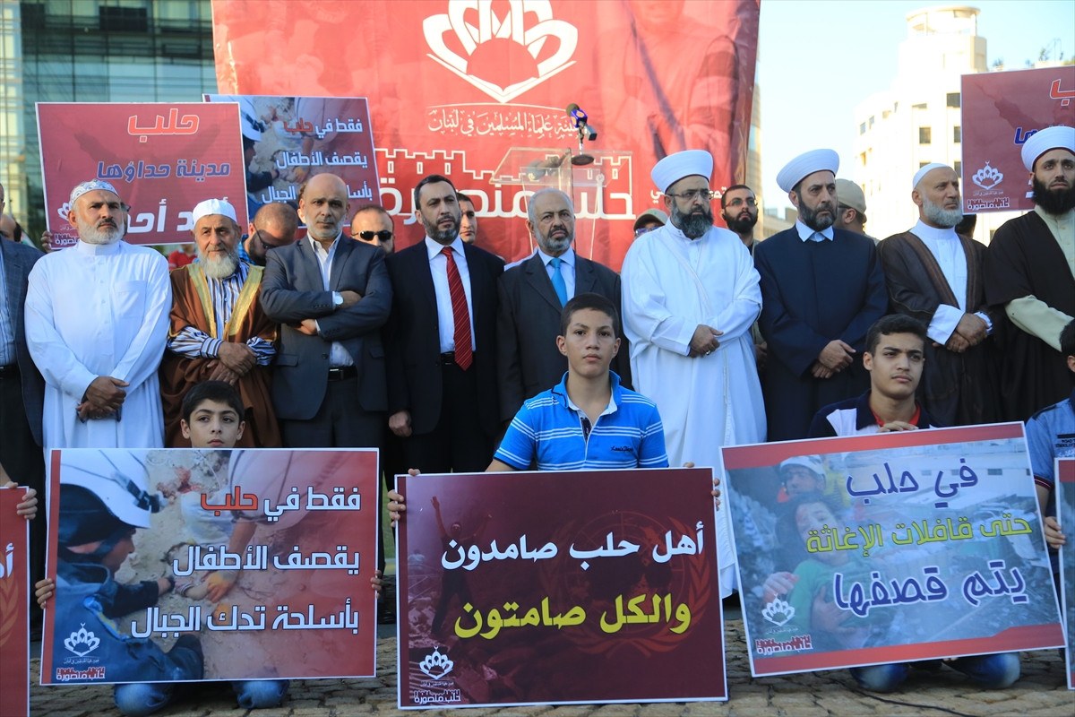 Başkent Beyrut'un merkezinde yer alan ESCWA'nın bahçesinde, her yaştan Lübnanlı ve Müslüman Alimler Birliği üyelerinden oluşan yaklaşık yüz kişilik grup Halep'te yaşanan insanlık dramına karşı "Direnen Halep'in zaferi" sloganıyla gösteri yaptı.