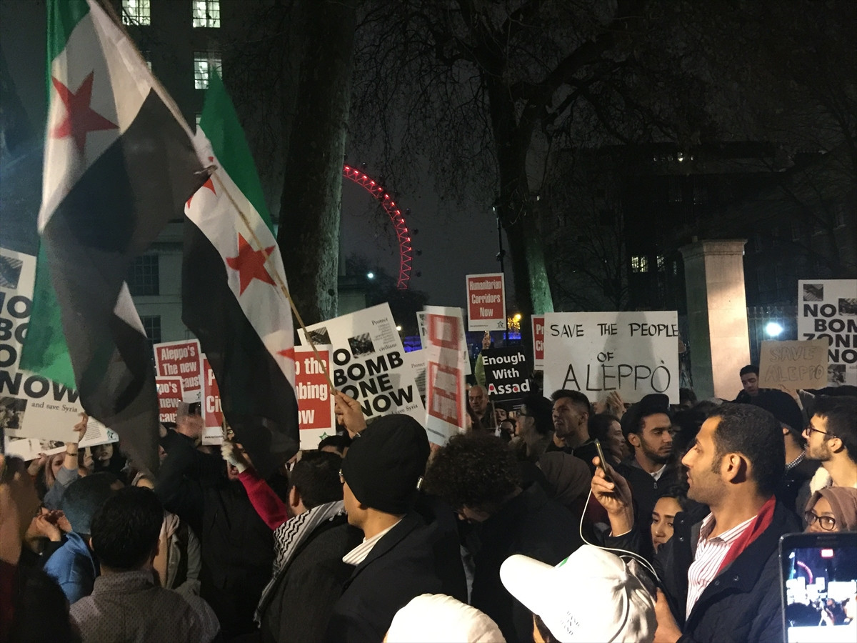 Halep'teki duruma dikkati çekmek amacıyla sosyal medya platformları üzerinden örgütlenen çok sayıda kişi, Londra'daki İngiltere Başbakanlığı binasının önünde bir araya geldi.