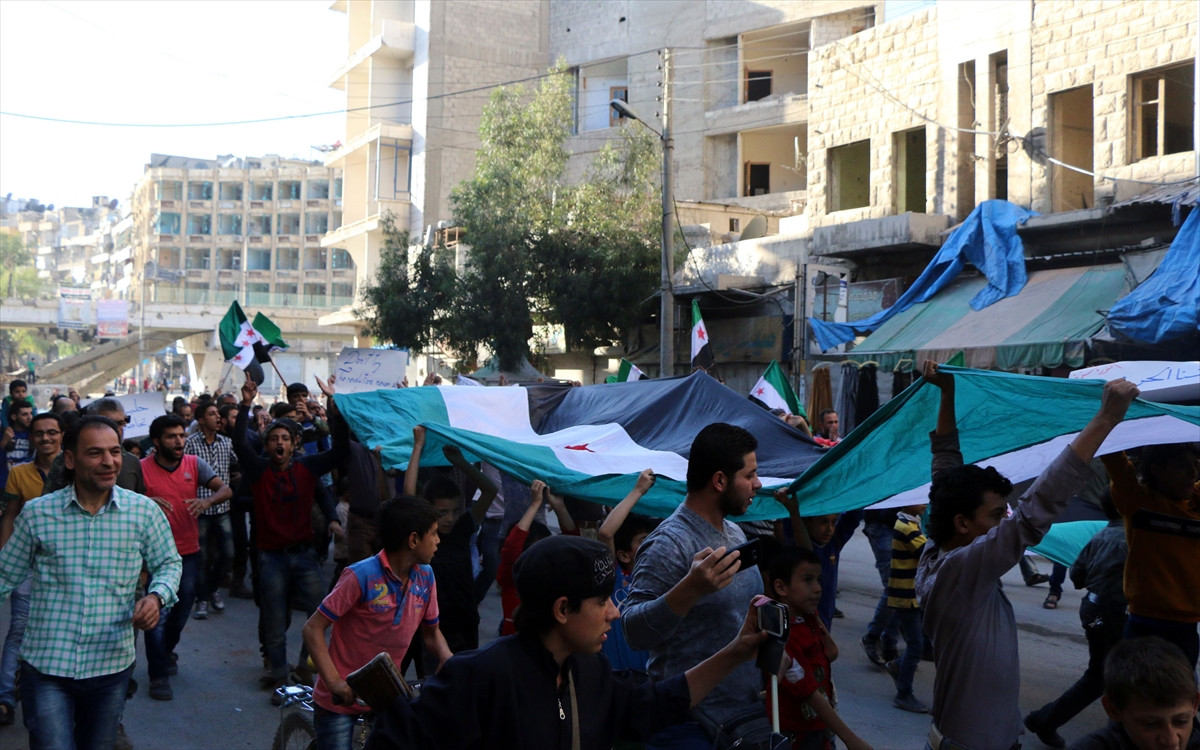 HALEP (AA) - Suriye'nin kuzeyindeki Halep kentinin rejim güçlerinin kuşatması altındaki doğu semtlerinde, Suriye rejimi ve Rusya karşıtı protesto düzenlendi.